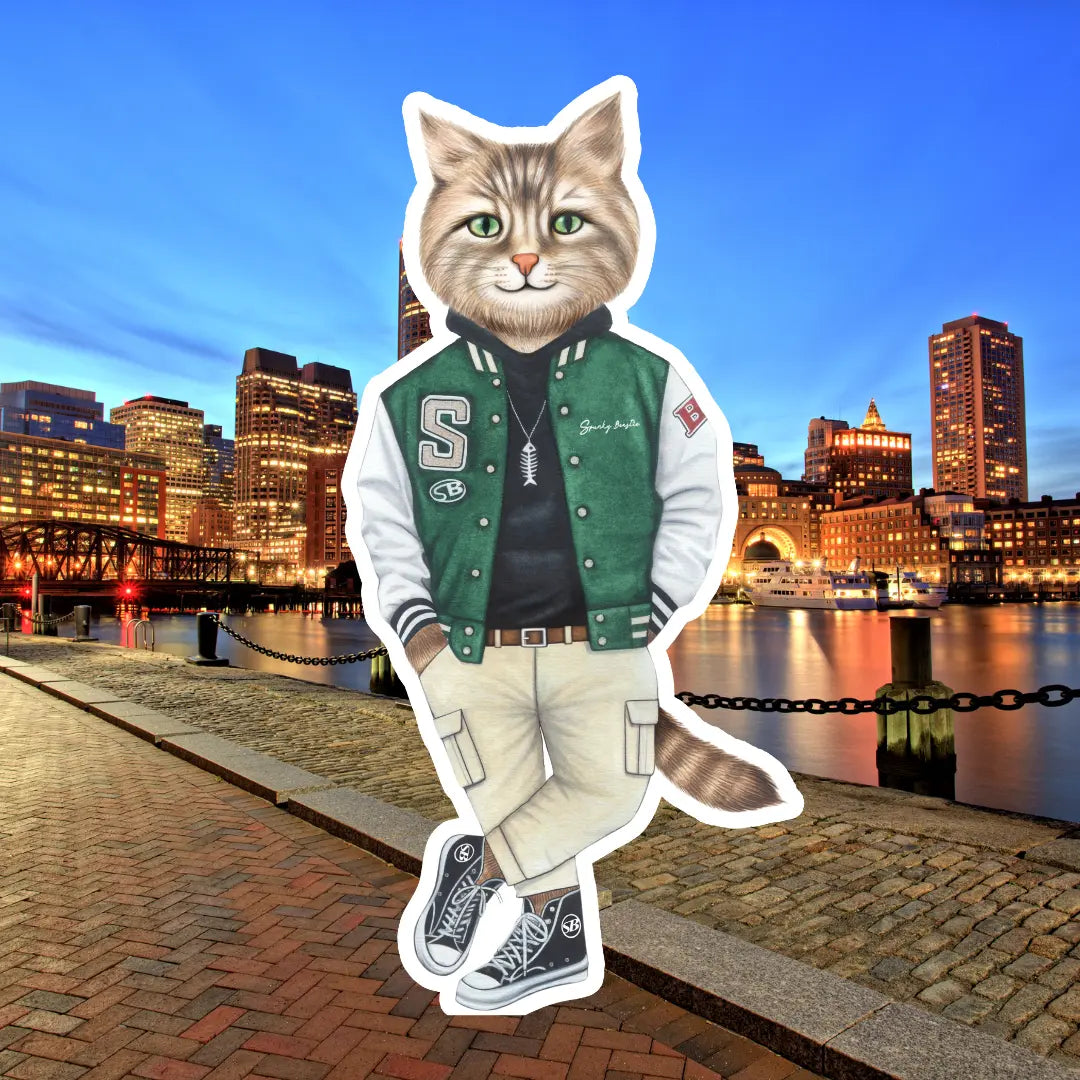 Spunky Cat z kolekcji Varsity Jacket to nasz ulubiony kot, który nie boi się wyzwań i zawsze stawia na wygodę w najlepszym stylu. Występuje w charakterystycznej stylizacji, nosząc na sobie klasyczną amerykańską kurtkę z dużymi literami na przodzie. Pod spodem nosi czarną bluzę z kapturem, która idealnie komponuje się z jego charakterem. Na szyi ma naszyjnik z rybką, który dodaje mu nutki szaleństwa i radości. Ten kocurek jest uosobieniem bycia trendy i beztroskiego podejścia do mody. Zawsze modny, zawsze stylowy, zawsze gotowy na zabawę!
