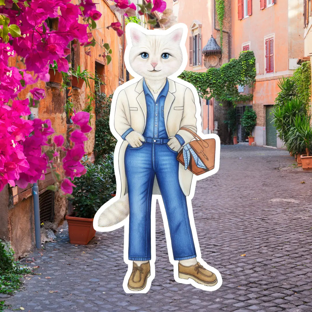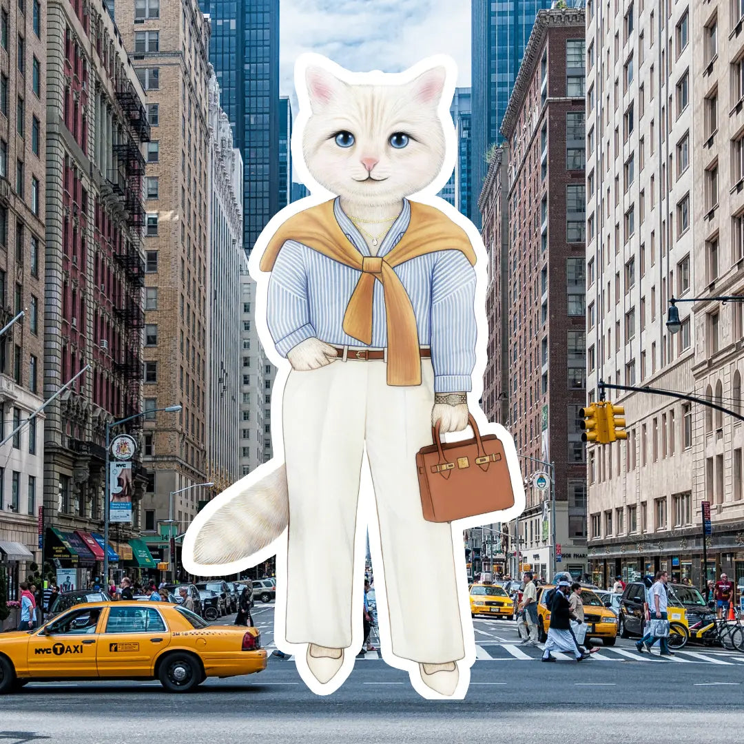 Spunky Cat z kolekcji Classy Chic to kotka o niezwykłym stylu i elegancji. Jej szerokie białe spodnie i niebieska koszula w białe paski tworzą harmonijne połączenie klasycznych elementów mody. Trzymając w łapce brązową elegancką torebkę, dodaje swojemu wyglądowi szczyptę klasy i szyku. Dodatkowo, biżuteryjny zegarek na łapce podkreśla jej modne podejście do ubioru. Spunky Cat to prawdziwa ikona mody w krainie kotów, która zawsze wie, jak wyglądać elegancko i szykownie w każdej sytuacji. Nie narzuca się, ale zawsze przyciąga wzrok swoją subtelnością i finezją.